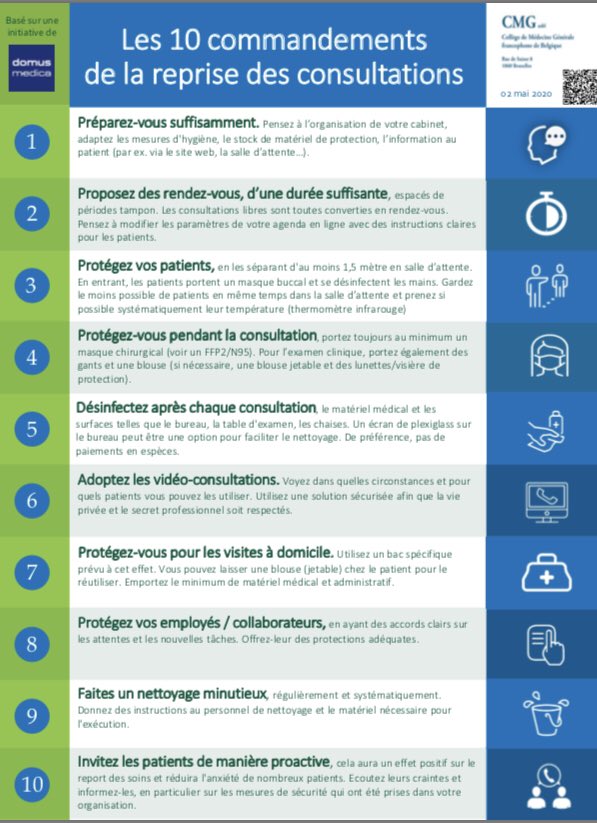 L'association de médecins Domus Medica a établi dix règles de base pour prendre les mesures (hygiéniques) nécessaires afin que les soins puissent être prodigués en toute sécurité. Le Dr Roel Van Giel, président de Domus Medica : "Ces dix règles de base fournissent une réponse à la question de savoir comment les médecins généralistes peuvent recommencer à exercer en toute sécurité avec le moins de risques possible pour le médecin et le patient. Les règles sont établies du point de vue du patient et du médecin généraliste".