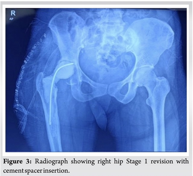 Cette patiente de 33 ans est vue dans un département d'orthopédie pour une douleur à la hanche droite. Dans ses antécédents, on note une chute, une lésion de la hanche dix ans auparavant gérée par un traitement conservateur. Deux ans plus tard, la douleur revient, sans cause traumatique, amenant à un usage à la demande d'analgésiques pendant 5 ans. Le diagnostic posé est une arthrose de la hanche droite secondaire à une nécrose avasculaire post-traumatique de la tête fémorale. En 2018, elle bénéficie dans un autre hôpital d'une prothèse de la hanche droite. A J3, elle présente une luxation réduite en urgence. A J18, elle présente une seconde luxation . A 3 mois, la patiente évolue favorablement avec des antalgiques à la demande. Au vu des douleurs persistantes, une biopsie écho-guidée est pratiquée  avec une recherche de germes qui reviendra négative. Quatre ans après son arthroplastie, la patiente est revue pour une douleur de plus en plus sévère au niveau de la hanche droite, associée à des difficultés à la marche, une sensibilité, un érythème local et une limitation de la mobilité de la hanche. Le taux de CRP est normal, la VS est élevée à 100 mm/h. Un nouvel aspirat ne montre toujours pas de croissance bactérienne. La patiente bénéficie d'une révision de prothèse avec débridement, retrait de la prothèse et l'utilisation d'un  spacer / ciment avec vancomycine. Une recherche microbiologique sur les échantillons de tissus péri-prothétiques et du liquide synovial revient positive pour un Candida albicans. La patiente est mise sous amphotéricine B IV et fluconazole pour 2 semaines. A J14, la plaie est sèche et saine. A 3 mois, le spacer est retiré et une révision est réalisée sans complications.  Elle est renvoyée à son domicile avec une prescription de fluconazole per os 400 mg 2x/j et cefuroxime 500 mg 2x/j. A 1 an, la patiente est asymptomatique sans signe radiologique de descellement de l'implant.