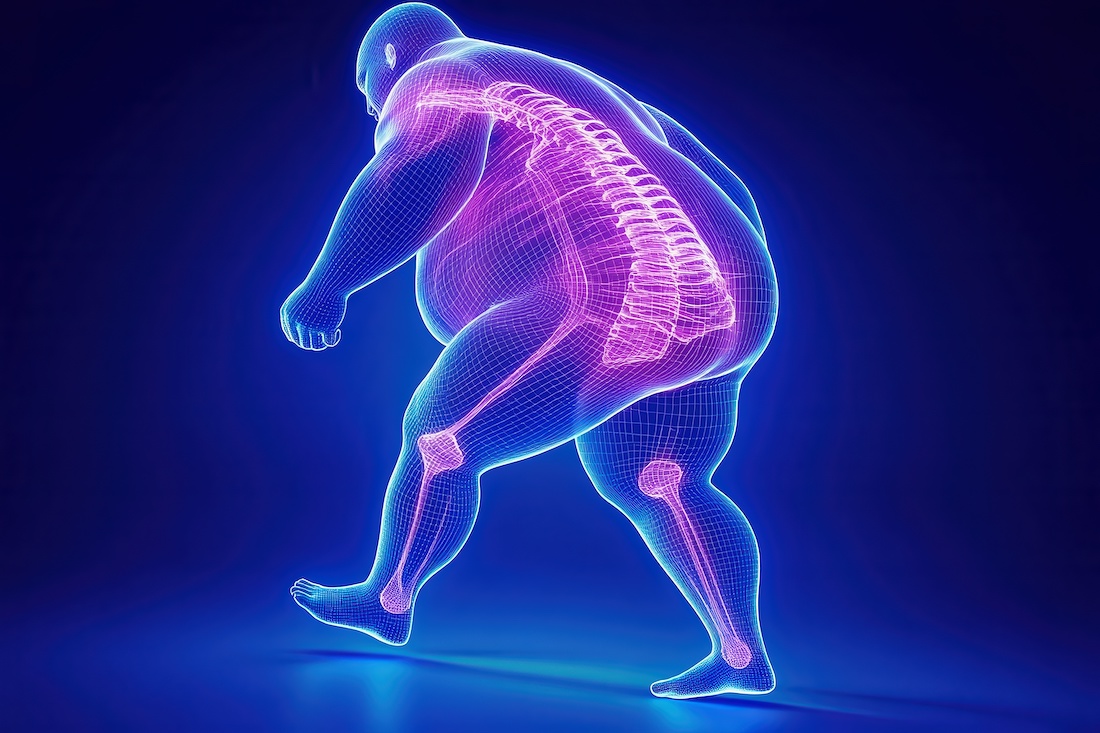 Les conséquences morphologiques de l'obésité sont les plus évidentes : l'accumulation de graisse exerce une pression sur les genoux, les hanches et la colonne vertébrale. Dans les cas extrêmes, cette pression peut entraîner une hernie discale. Une prise de poids rapide peut avoir le même effet : les os, les muscles et les articulations ont besoin de temps pour s'adapter au nouveau poids. Une étude montre que les personnes qui ont pris 6 kg en un an ont 1,42 fois plus de risques de souffrir de maux de dos que l'année précédente (Lee et al., 2021).