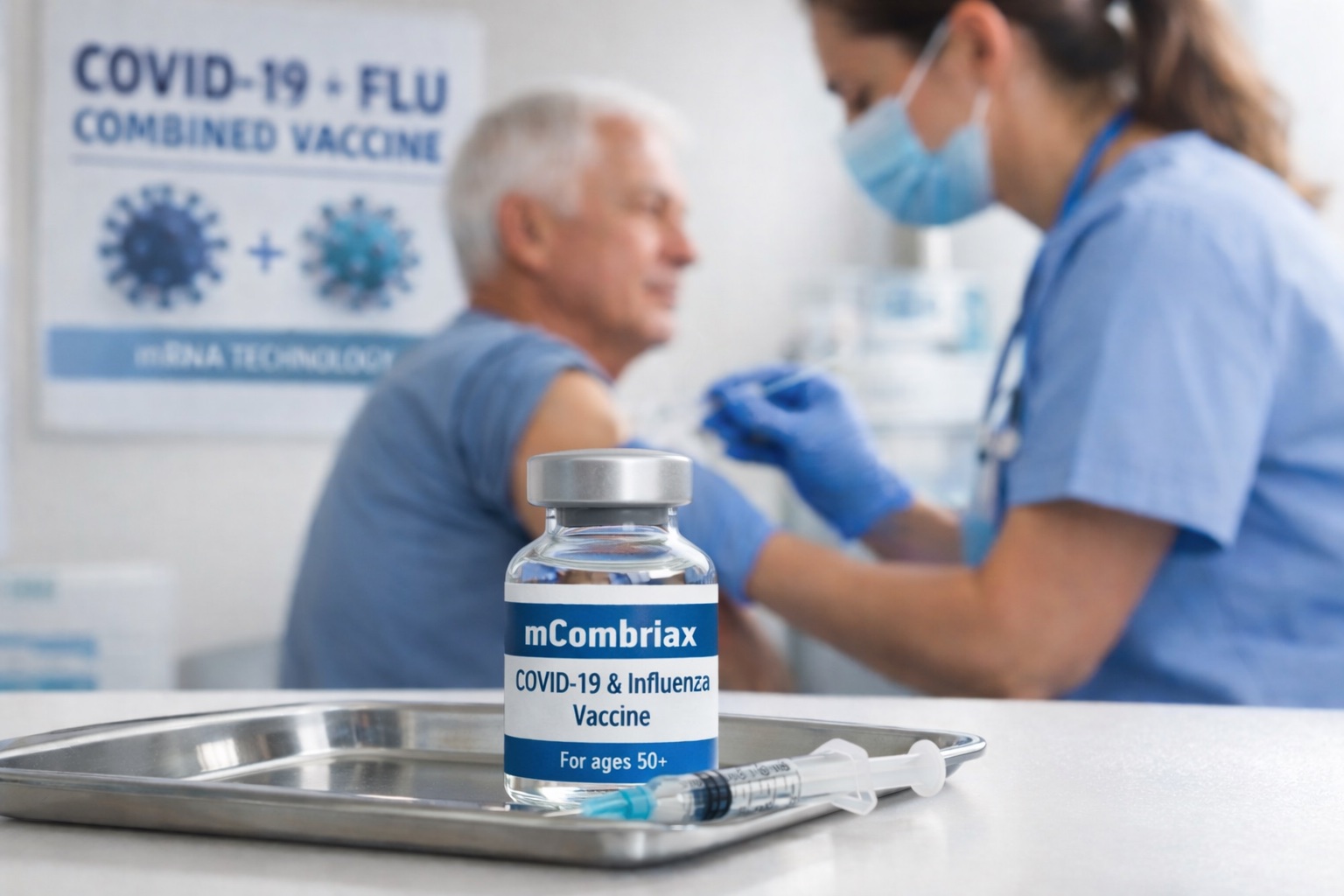 Développé par le laboratoire Moderna, ce vaccin, dénommé mCombriax, contient des ARN messagers (ARNm) codant pour la protéine Spike, mais aussi, côté grippe, pour les hémagglutinines des souches A/H1N1, A/H3N2 et B/Victoria. Le 27 février, les experts européens du CHMP se sont prononcés en faveur d'une AMM, en vue d'une utilisation chez les personnes de plus de 50 ans.