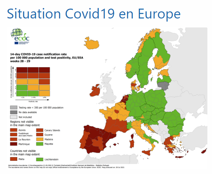 BRUSSEL 01/08 - Des régions du Danemark, de la France, de la Grèce et de l'Italie se sont colorées de rouge dimanche sur la carte du risque d'infection au coronavirus, selon le site internet info-coronavirus.be.