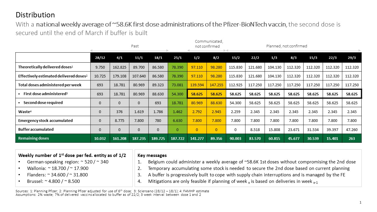 Uit het huidige overzicht blijkt dat volgende week in België een eerste dosis kan toegediend worden bij 58.625 5.750 personen met respectievelijk het Pfizer of het Moderna vaccin. Bijkomend zal volop de 2de dosis in de woonzorgcentra toegediend worden, waardoor de immuniteit de komende weken maximaal zal worden opgebouwd bij deze ouderen.