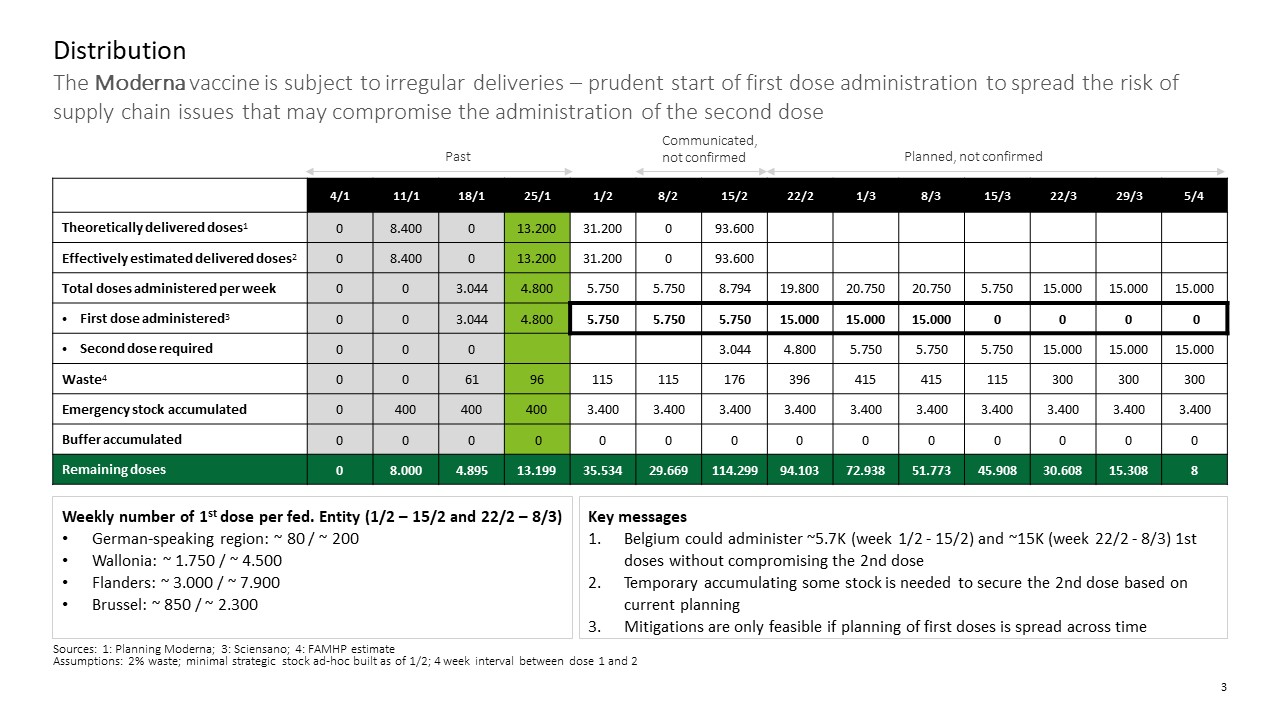Sinds vorige week nam ook de vaccinatie van zorgverleners op spoedgevallen, intensieve zorgen en de COVID-afdelingen in de ziekenhuizen met het Pfizer en ook het Moderna-vaccin een aanvang. De verminderde levering van Moderna vaccins (25.200 ipv 31.200) zal weinig impact hebben op de vaccinatiecampagne, zolang Moderna zijn volgende leveringen, die veel belangrijker zijn, nakomt.
