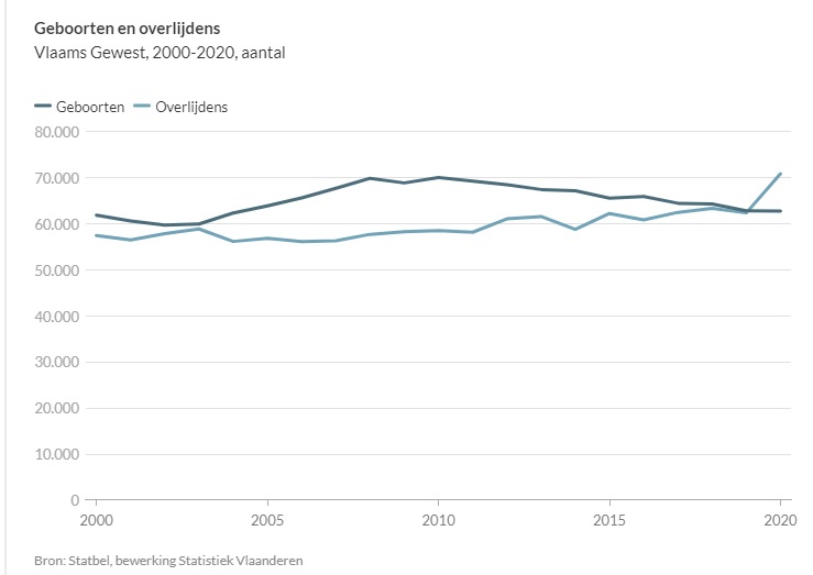 BRUSSEL 08/07 - In 2020 zijn er 70.919 inwoners van het Vlaamse Gewest overleden. Dat zijn er 8.499 (of 7 procent) meer dan wat er voor 2020 verwacht werd en dus is er sprake van oversterfte. Het gaat om voorlopige cijfers van het totaal aantal overlijdens voor alle doodsoorzaken samen, niet enkel overlijdens als gevolg van COVID-19. Tegelijk waren er vorig jaar minder geboorten dan overlijdens. Dat meldt Statistiek Vlaanderen.