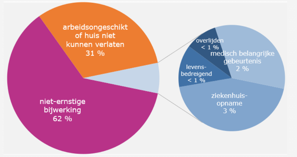 In 31% van de gevallen ging het om arbeidsongeschiktheid of het huis niet kunnen verlaten. 7% van de bijwerkingen was ernstig (overlijden < 1%, ziekenhuisopname 3%, levensbedreigende bijwerkingen < 1% en significant medisch accident 2%). Het aantal bijwerkingen was lager met het vaccin van Pfizer (0,24%) dan met het vaccin van Moderna (0,50%) en AstraZeneca (0,59%).