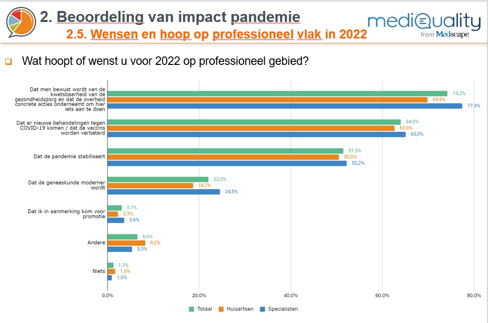 BRUSSEL 17/12 - Net als 2020 was het voorbije jaar bijzonder hectisch voor artsen en ander zorgpersoneel. Maar hoe zien huisartsen en specialisten de situatie volgend jaar? Waar hebben ze het meest schrik van en op welke (gunstige) ontwikkelingen hopen ze? Gaan ze meer of minder verdienen in 2022? Een recente (mini)bevraging van MediQuality komt met de antwoorden op deze vragen.