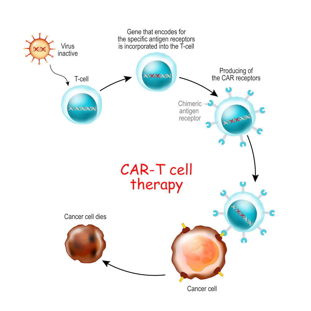 CAR-T-cellen (T-cellen met een chimere antigeenreceptor) worden alsmaar belangrijker bij de behandeling van bloedkanker, vooral bij de behandeling van een agressieve tumor. Zo worden een recidief van of een refractair lymfoom sinds kort behandeld met bv. Kymriah®, Yescarta® of Breyanzi®. In een studie, die op het laatste congres van de American Society of Clinical Oncology (ASCO 2023) is gepresenteerd, is ook een sterke en lang aanhoudende respons verkregen bij de behandeling van patiënten met een CLL met CAR-T-cellen.1